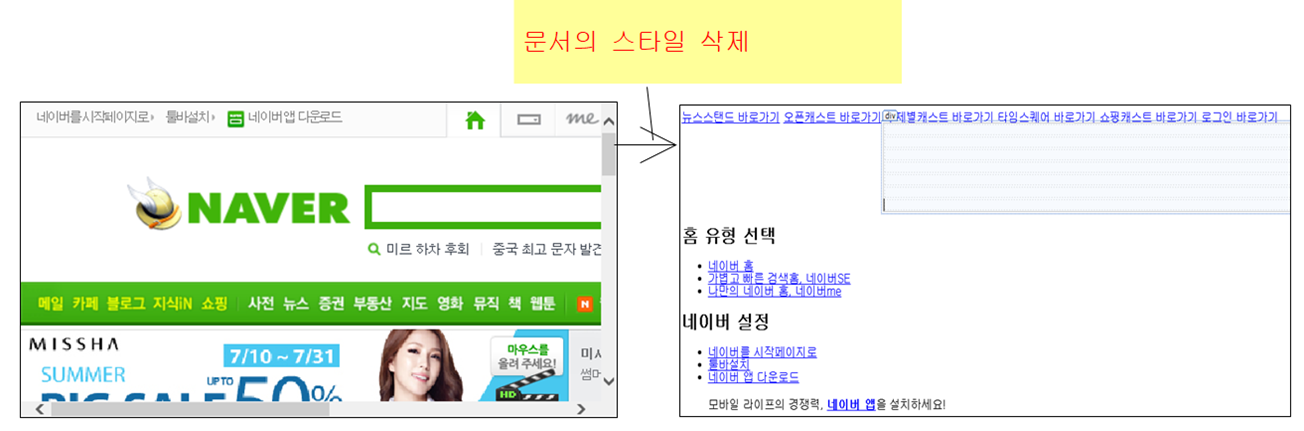 왼쪽 이미지는 우리가 흔히 보는 네이버 페이지이고, 이 페이지의 무서 스타일을 삭제 하면,
